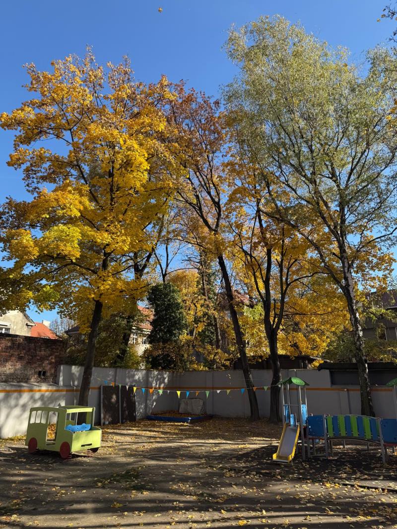 Przedszkole posiada duży, ogrodzony, bezpieczny ogród wraz z kolorowym wyposażeniem. Dużą część ogrodu zajmuje "strefa doświadczalna"- składająca się min. z zegaru słonecznego, obserwatorium mrówek, stacji pogodowej oraz ekologicznego ogródka, w którym samodzielnie sadzimy, hodujemy i dbamy o rośliny.